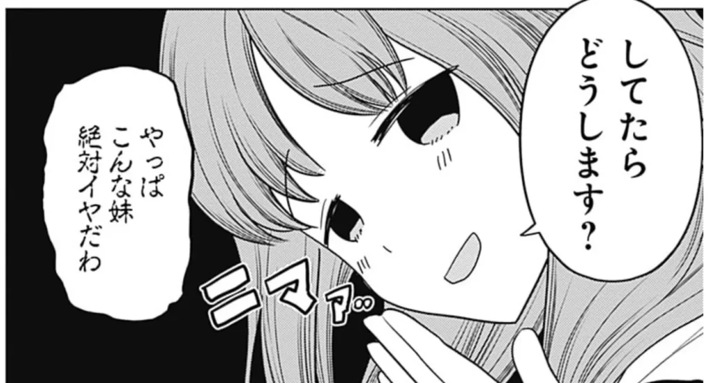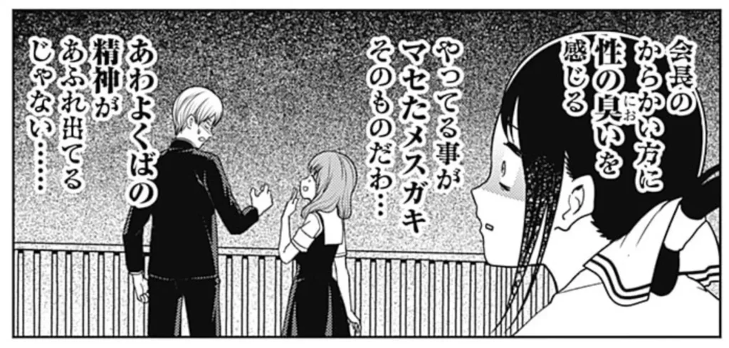 かぐやの臭いセンサーは正確です。ミコちゃんは確かに会長とかぐやをベストCPだと思っているのだろうし、またそれを邪魔する気もないだろう。しかし性の臭いをばら撒いていることもまた事実。ミコちゃんはそれをやってしまうんです。石上たいへんだね……。